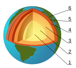 ![]() 1. Жердің ішкі ядросы 2. Сыртқы ядросы 3. Мантия 4. Сыртқы мантиясы 5. Жер қыртысы 6. Литосфера | Тереңдігі (км) | Қабаттар (геосфералар) | Тығыздығы (г/cм3) |