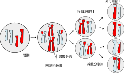 5. Мейоз нәтижесінде гаметаларда хромосомалардың еркін комбинациялану ықтималдығы күшейе түседі, себебі әрбір гомологті хромосомалардың (әкесінен және шешесінен алынған) екі гаметаға ажырау ықтималдығы 1/2 тең, ал барлық хромосома саның алатын болсақ олардың гаметаларда еркін комбинациялану ыктималдығы 2 п дәрежесіне, яғни адамдарда 223 дәрежесіне тең. Былайша айтқанда, бір гаметаға тек қана әкесінен алынған хромосомалар, ал екіншісіне шешесінен алынған хромосомалардың топтасу мүмкіншілігі өте аз мөлшерде болады (1/2)22 =1/4 194304 яғни 1/4000000-на тен.