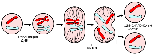 Митоздық бөлінуі кезінде бір диплоидты жасушадан (2n) генетикалық материалы теңдей бөлінген екі диплоидты жасуша түзілген. Жасушалардың бөлінуге дайындық кезеңі — интерфаза кезеңінде, сонымен қатар митоз барысында бірінен соң бірі жүретін және өзара байланысты процестер жиынтығын митоздық цикл деп атайды, ол тіршілік циклінің бір бөлігін құрайды. Митоз 4 фазадан тұрады. Митоз көп жасушалы ағзалар жасушаларының көбеюінің негізгі жолы болып табылады.