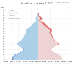 Қазақстанда ер балалардың дүниеге келуі басым болғанымен әйелдер саны 30 – 34 жастан бастап айтарлықтай көбейеді. 60 – 69 жаста 1,5 есе, 70 жаста 3 есе артады. Тұтастай алғанда, республикада әйелдер саны ерлерден басым.