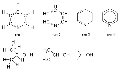 • толық түрі — мұнда химиялық қосылыстың бүкіл элементтері мен байланыстары көрсетіледі (1);